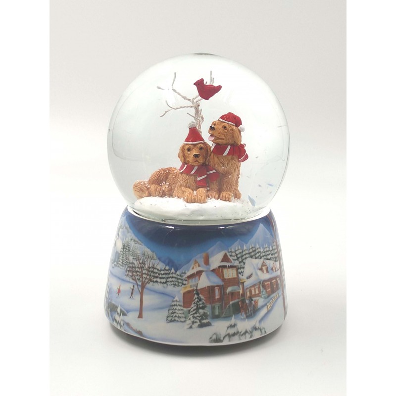 Snowglobe 100 mm with 2 Dogs and Cardinal. Automatic snow swirling, color changing light and music